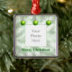 3 Green Christmas ornaments on a shimmery background. Customisable text says "Merry Christmas".