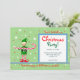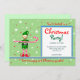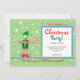 A cute kids Christmas Elf party invitation with my design of a little Elf holding a candy cane and red and white stars on a green background. Customise the text to your preferences.