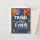 This is a colourful artwork which features a travel quote by Pierre Bernardo. According to the author, travelling makes one evolve. The text is designed with an artistic lettering style putting emphasis on the words "travel" and "evolve." All the words are in white. There are flowers and flower petals both large and small and in different shapes that surround the saying. They are in pink, yellow, and orange. Additional details are large and small leaves that are coloured pink, orange, and shades of purple. The background is drawn with highly detailed zentangle lines and is coloured with different shades of green.