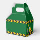Cool custom construction excavator birthday party favour boxes in green for a child who loves yellow construction vehicles. Fun vehicle favours for a little boy who loves cars and trucks. Customise with your kid's name between the black and yellow caution tape.