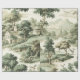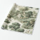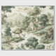 A classic Toile de Jouy pattern wrapping paper in deep muted green featuring rolling countryside scenes, charming village details, and vintage hot air balloons drifting above the landscape. This elegant monochromatic design captures a timeless French aesthetic. Ideal for lovers of traditional décor, cottage style, travel-themed art, and unique vintage-inspired gifts.