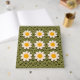 This charming crochet-inspired image features a repeating granny square pattern with white daisies and golden yellow centers on a rich green background. Perfect for lovers of handmade aesthetics, retro floral designs, and cozy cottagecore style. Ideal for use on stationery, home décor, fabric prints, phone cases, or gifts, this design evokes warmth, creativity, and vintage charm. A great choice for crafters, crochet fans, and anyone who appreciates floral textile patterns with a soft, handmade feel.