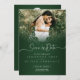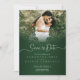 This elegant Save the Date card showcases a rich green damask pattern that beautifully frames the couple’s custom photo. The refined typography brings a modern and graceful look, while the design combines traditional damask artistry with a fresh, contemporary style. The monogram-inspired layout highlights the couple’s names and wedding date with sophistication, making it a perfect way to announce your special day. The lush green tones add a timeless, romantic touch.