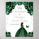 This elegant and glamourous sweet sixteen welcome sign features a beautiful princess with dark skin in a dark green ball gown. The text combines handwritten script and modern sans serif fonts for a classy and sophisticated look. The floral arrangements, butterfly and gold confetti create the perfect blend of rustic and chic.