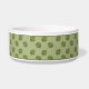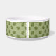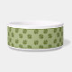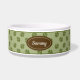 Green dog paw print pattern background with a brown badge that has a personalizable text area ideal for the name of the pet. The font is a lovely script font in white colour to match the white material of the bowl. This design is ideal for a space decorated in rustic style or for anyone who likes the brown and green colour combination we see in the nature.