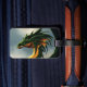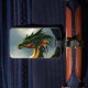 Side profile portrait of a green dragon. Blue skies in behind the green dragon.