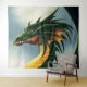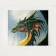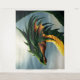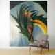 Portrait profile of a green dragon. Blue skies in behind the dragon.