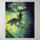 This fantasy art poster features a green earth dragon flying through a forest nature scene.