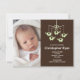 Sweet elephants Baby Boy Birth announcement features an adorable Green elephants baby mobile on a trendy brown background. Customise with your newborn baby's picture and birth information and you're all set to go. Matching items available in our shop. ©Cocoa Studio
