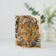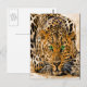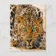 Bright green eyes. On a wild cat with black and white and orange spots. He is laying down on all four paws. Looking at you. With his eyes open wide. On this cool postcard