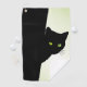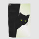Sly black cat with emerald green eyes looks out from behind black wall into a green room.