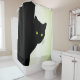 Sly black cat with emerald green eyes looks out from behind black wall into a green room.