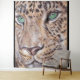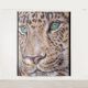A close-up of a leopard's face, mouth closed as it stares dreamily into the distance. A special feature is that its eyes are green instead of the usual yellow colour. It makes it an especially interesting focal point in any room of your choosing. A reproduction of a coloured pencil drawing by Joyce Jackson.