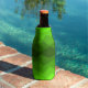 This bottle cooler has a geometric design of five shades of green running horizontally.