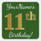 Green, Faux Gold 11th Birthday + Custom Name Square Sticker