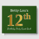This guest book design features the ordinal number "12th" with a faux gold-like appearance. It also features a customised name, and a green coloured background. It could be used at a party for somebody celebrating their twelfth birthday. [~Z0000056]