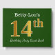This guest book design features the ordinal number "14th" with a faux gold-like appearance. It also features a customised name, and a green coloured background. It could be used at a party for somebody celebrating their fourteenth birthday. [~Z0000056]