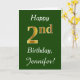 This simple birthday card design features the message "Happy 2nd Birthday", with the "2nd" having a faux gold-like appearance. It also features a custom name, and a dark green background. It could be given to somebody who is celebrating their second birthday.