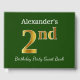 This guest book design features the ordinal number "2nd" with a faux gold-like appearance. It also features a personalised name, and a green coloured background. It could be used at a party for somebody celebrating their second birthday. [~Z0000056]
