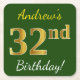 Green, Faux Gold 32nd Birthday + Custom Name Square Paper Coaster