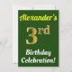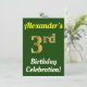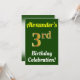 This birthday party invitation design features a message like "Alexander’s 3rd Birthday Celebration!", where the name can be personalised, and where the number "3rd" has a faux gold-like appearance. It also features a green coloured background. The event details on the back can be personalised. It could be used to invite people to somebody’s third birthday celebration or birthday party. [~Z0000121]