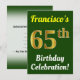 This birthday party invitation design features a message like "Francisco’s 65th Birthday Celebration!", where the name can be personalised, and where the number "65th" has a faux gold-like appearance. It also features a green coloured background. The event details on the back can be customised. It could be used to invite people to somebody’s sixty fifth birthday celebration or birthday party. [~Z0000121]