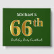 This guest book design features the ordinal number "66th" with a faux/imitation gold-like appearance. It also features a custom name, and a green coloured background. It could be used at a party for somebody celebrating their sixty sixth birthday. [~Z0000056]