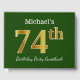 This guest book design features the ordinal number "74th" with a faux/imitation gold-like appearance. It also features a custom name, and a green coloured background. It could be used at a party for somebody celebrating their seventy fourth birthday. [~Z0000056]
