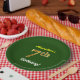 This simple, personalised, birthday-themed paper plate design features a customisable message like "ANameHere’s 7th Birthday!", where the name can be changed, and with the "7th" having a faux/imitation gold-like appearance. It also features a green coloured background. Paper plates like these could perhaps be used at a party being held to celebrate somebody’s seventh birthday. [~Z0000145]