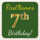 Green, Faux Gold 7th Birthday + Custom Name Square Paper Coaster