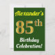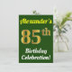 This birthday party invitation design features a message like "Alexander’s 85th Birthday Celebration!", where the name can be customised, and where the number "85th" has a faux gold-like appearance. It also features a green coloured background. The event details on the back can be customised. It could be used to invite people to somebody’s eighty fifth birthday celebration or birthday party. [~Z0000121]