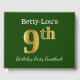 This guest book design features the ordinal number "9th" with a faux gold-like appearance. It also features a customised name, and a green coloured background. It could be used at a party for somebody celebrating their ninth birthday. [~Z0000056]