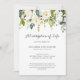 Funeral remembrance invitation featuring a nature, floral, watercolor invite celebration of life template that is easy to personalize. Elegant, white and greenery flowers botanical design with gray text.