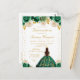 This elegant and glamourous Quinceañera birthday postcard features a beautiful princess with dark hair in a tiara and green ball gown. The text combines handwritten script and modern sans serif fonts for a classy and sophisticated look. The floral arrangements and gold confetti create the perfect blend of rustic and chic.