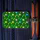 An easy to recognise floral pattern green luggage tag. There are cute colourful flowers against a green grasslike background.