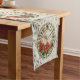 A festive table runner in rich greens, accented by a charming miniature clock encircled by a vibrant poinsettia. The foliage creates a feeling of lush abundance. Our "Green Foliage & Poinsettia Clock" table runner brings a touch of holiday cheer to any table. This runner features a delicate clock design encircled by a brilliant poinsettia and accented with lush green foliage. Perfect for Christmas or winter celebrations.
