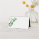 Pretty folded place card done in a white watercolor paper look, with graphics of two sprigs of greenery, on front and back. The inside of the card is done in a dark green. Personalise the front of the card by hand for each guest at your reception.