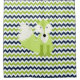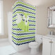 Shower curtain with a background of navy blue, green, and white chevron stripes and a cute green chevron fox!