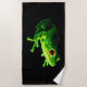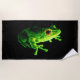A fun beach towel with a fractalized green frog with contrasting orange eyes on a black background.