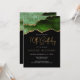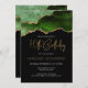 This trendy birthday invitation features a watercolor image of an agate geode in shades of dark, medium, and light green, with faux gold highlights. The words "70th Birthday" appear in faux gold glitter in decorative modern handwriting font. Customise it with the name of the guest of honour in gold art deco font and the party details in white sans serif type. The same green agate image appears on the reverse side.