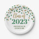 Customisable graduation party class of 2023 plates in glamourous gold and green confetti pattern and elegant hand lettered style text.