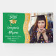 Celebrate your favorite graduating senior with this green and gold tone "Congrats Graduate" photo design. The template features a wavy look on the left side with the word "Graduate" on the gold wavy background accompanied by a gold tone graduation cap to the left and your graduate's class year, name and school in white. Simply update with your grad's photo on the right and information on the left. Original illustration and design by Holiday Hearts Designs (rights reserved) with placeholder photo credit to Logan Isbell via Unsplash.