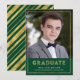 Announce your graduation with this classy modern photo graduation announcement featuring the word "Graduate" in a stylish geometric line font and a border both in faux gold foil against a green background. Card has a faux gold foil stripes pattern against a green background back side.