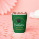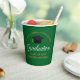 These chic green and gold custom senior graduation party paper cups feature classy white typography under a high school or college name for the class of 2026. Customize this cup with your graduating year under the elegant calligraphy for great personalized graduate decor.
