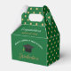 This green and gold custom senior graduation party favor box features chic white and gold typography under a high school or college name for the class of 2026. Customize with your graduating year under the lovely congratulations calligraphy for a great personalized graduate ceremony decoration. Classy polka dots decorate the sides.