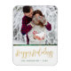 Send someone happy holidays with this unique magnet, where you can add your own photo. Happy Holidays is written in a hand drawn script font, and covered in a gold foil texture. There is a spot to add your name and a year.