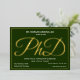 A PhD graduation party invitation with gold foil, white text, and a green background. Simply add your information, add this invitation to your cart, and celebrate this major accomplishment.