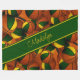 This sporty basketball team colours fleece blanket features the images of realistic, varied size basketballs turned every which way, arranged in a 3D look pattern and overlying the images of abstractly oversized basketballs - two panels on each of the patterned basketballs have been recolored--one green and one gold - customise with her name on a chunky full width angled green colour strip - by katz_d_zynes