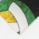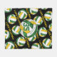 This sporty volleyball team spirit fleece blanket for girls features a large green, gold and white artsy, stylised volleyball, upon which her name and jersey number can be personalised, overlying a pattern of smaller green, gold and white volleyballs and the sporty font text "I love volleyball" that stretches between the angled rows of volleyballs - background is customisable black - by katz_d_zynes
