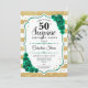 Surprise 50th Birthday Party Invitation. Feminine emerald green design with faux glitter gold. Features white and gold stripes, roses, script font and confetti. Perfect for an elegant women's bday celebration. Can be personalized to show any age. Printed Zazzle invitations or instant download digital printable template.